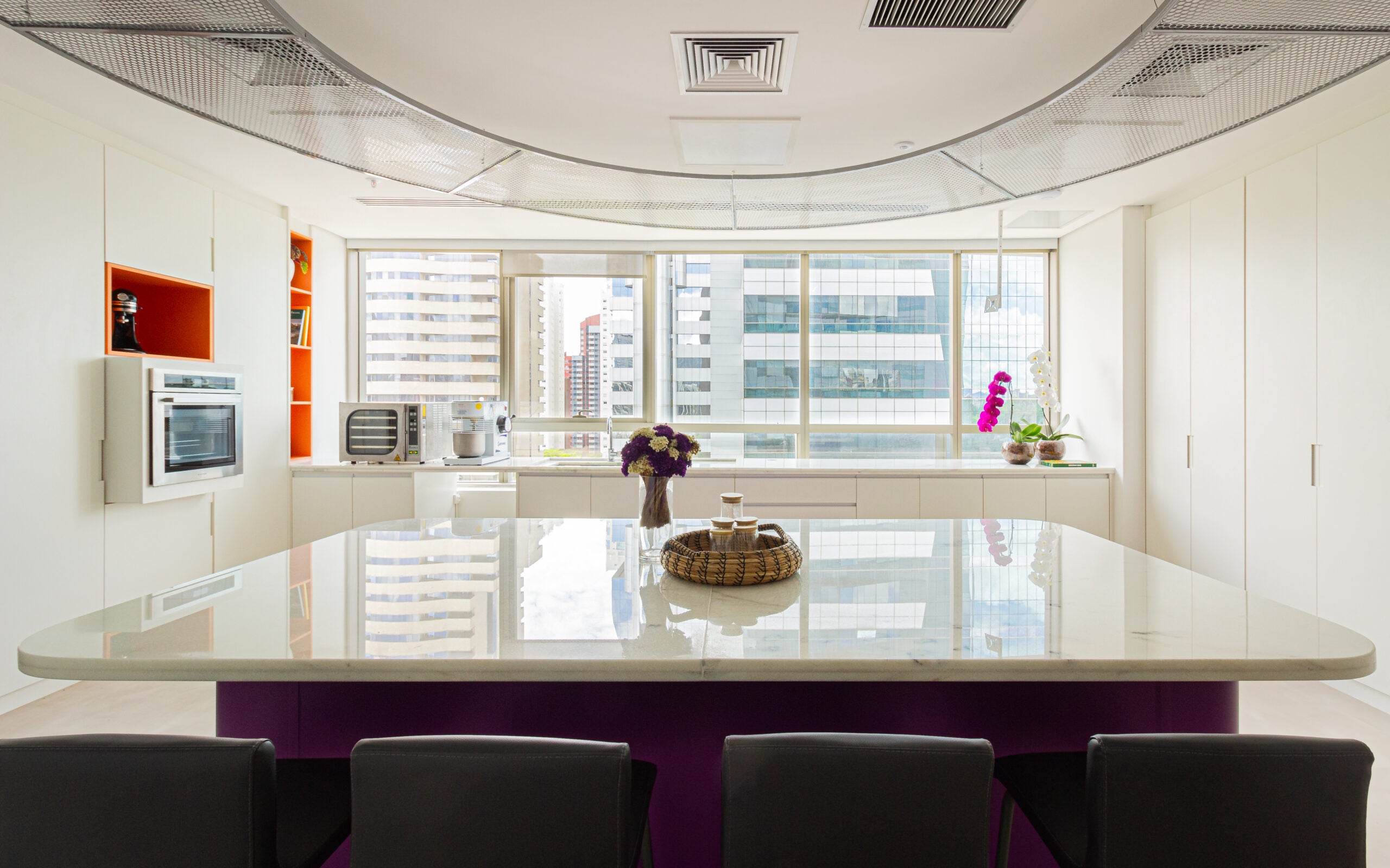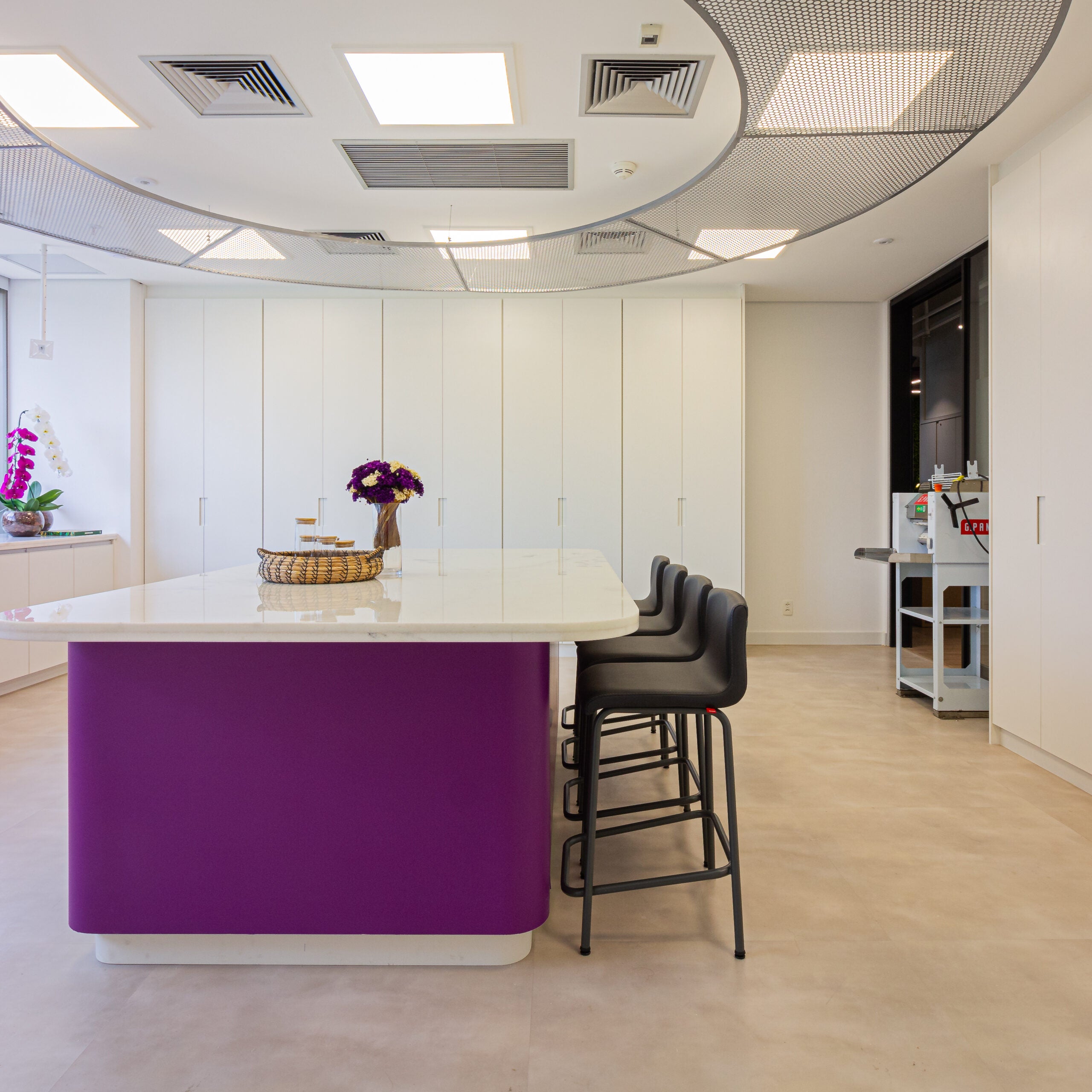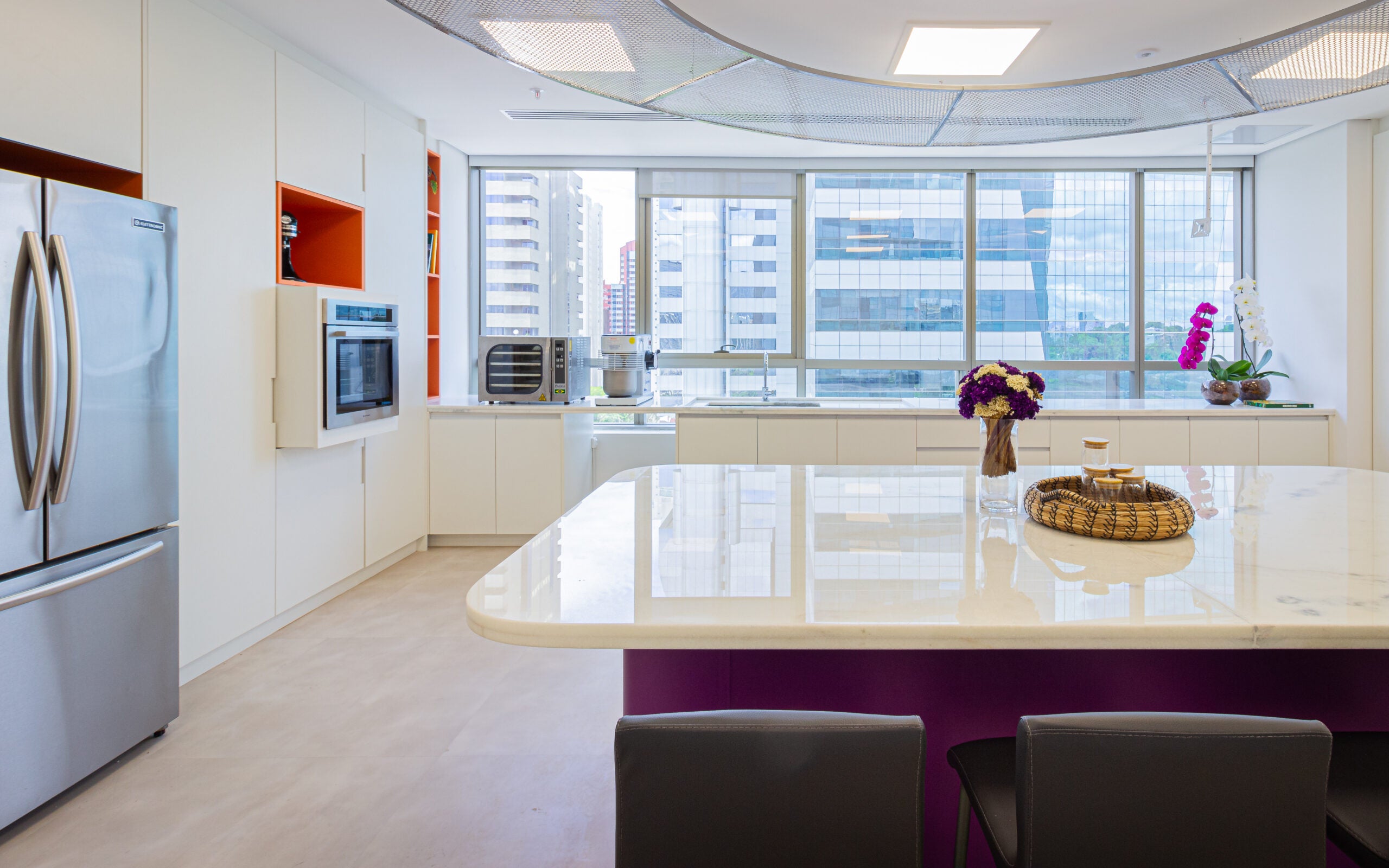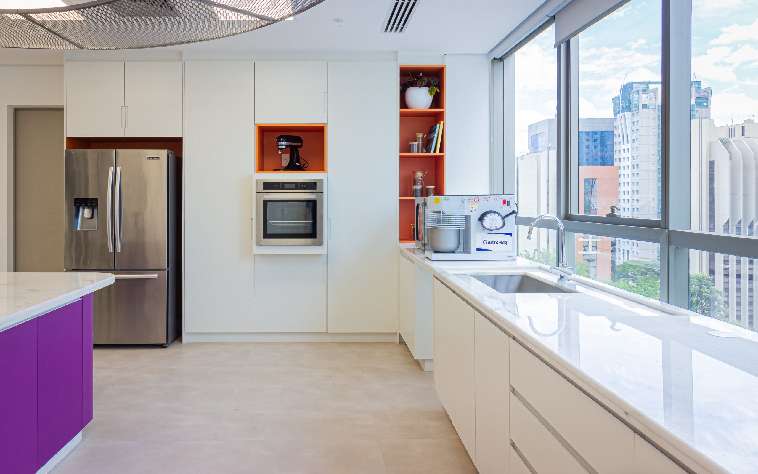 O layout se organiza a partir de uma ilha central em mármore, que atua como eixo estratégico dos processos, complementada por bancadas lineares que ampliam as áreas de trabalho e facilitam a higienização. A iluminação natural foi priorizada, proporcionando leveza e conforto visual ao ambiente.