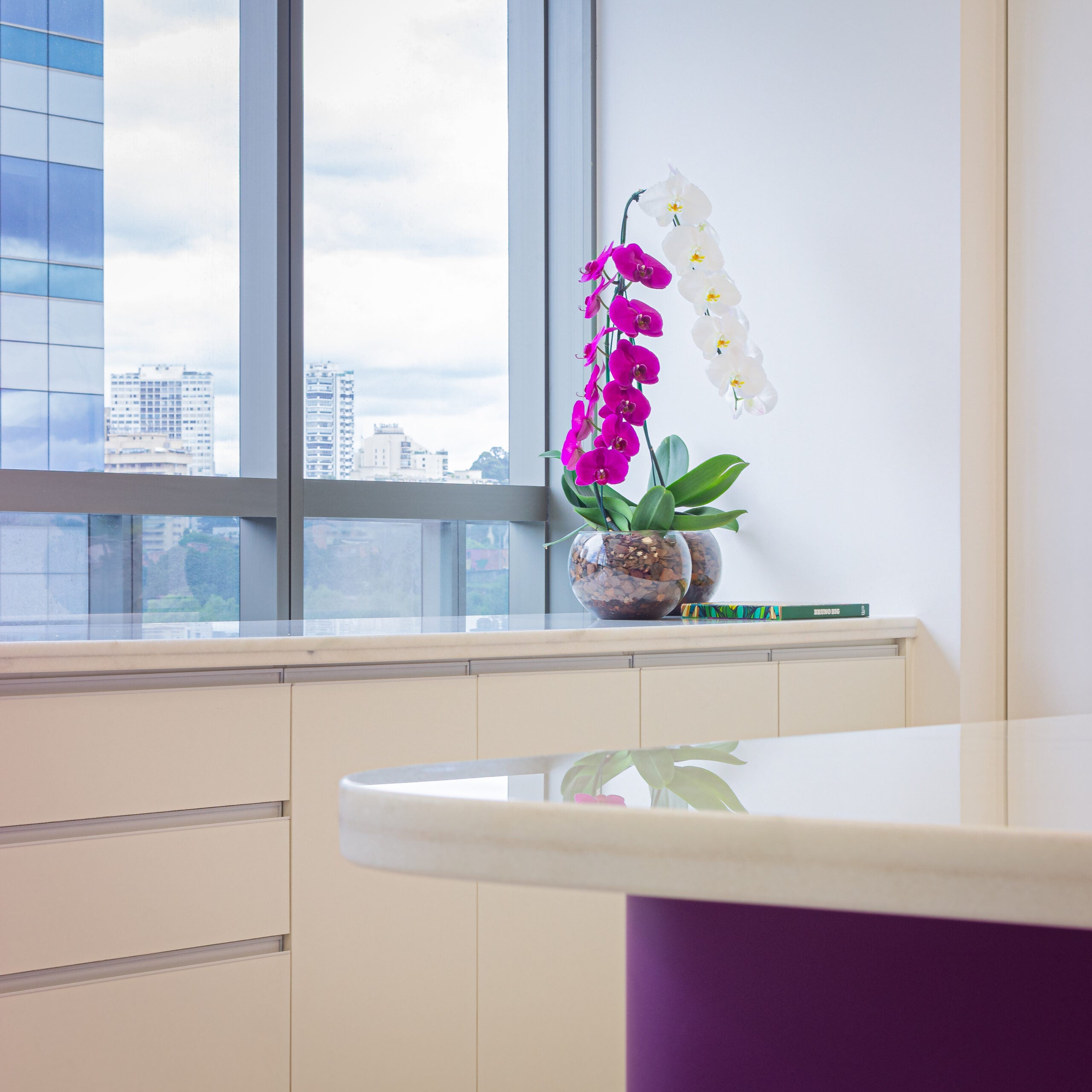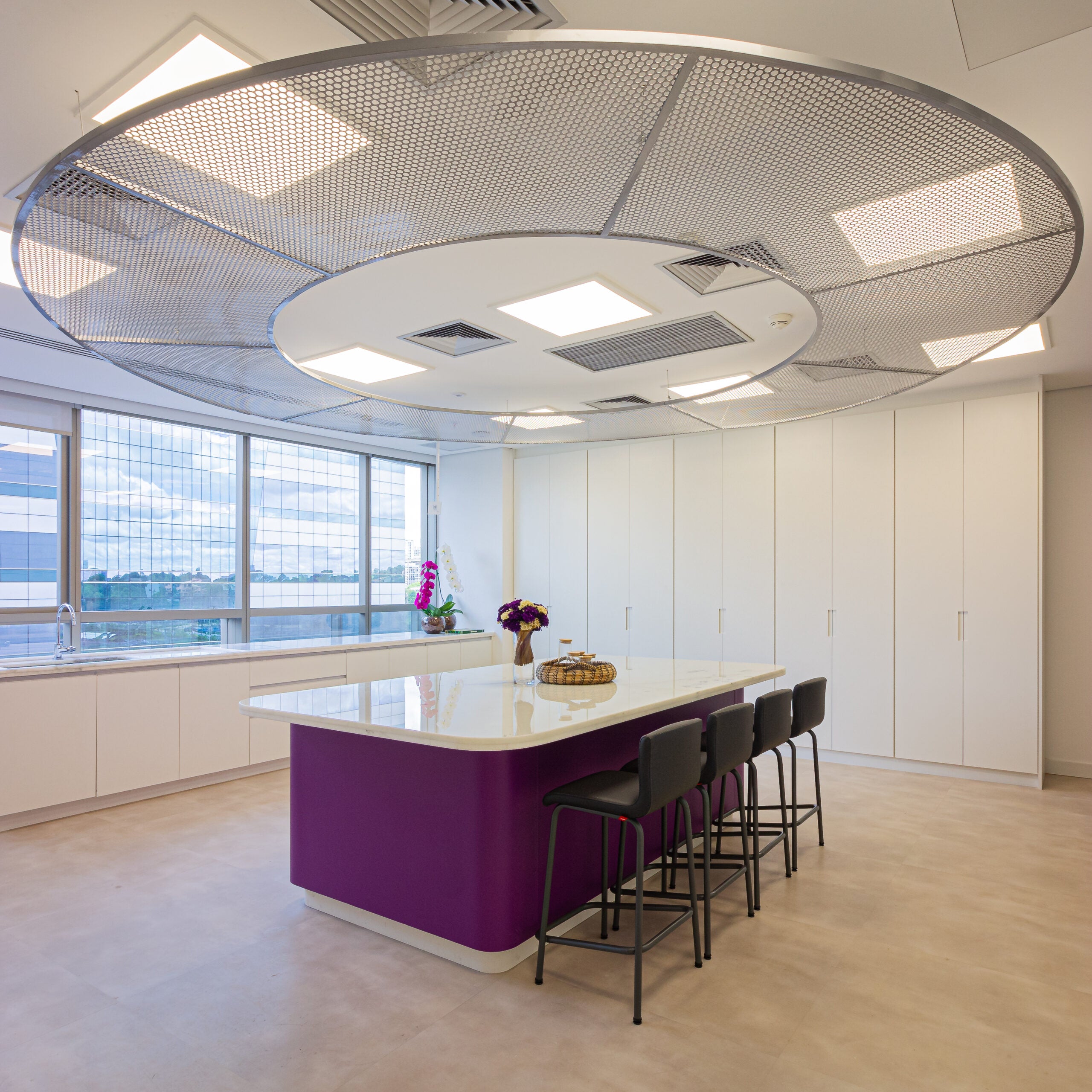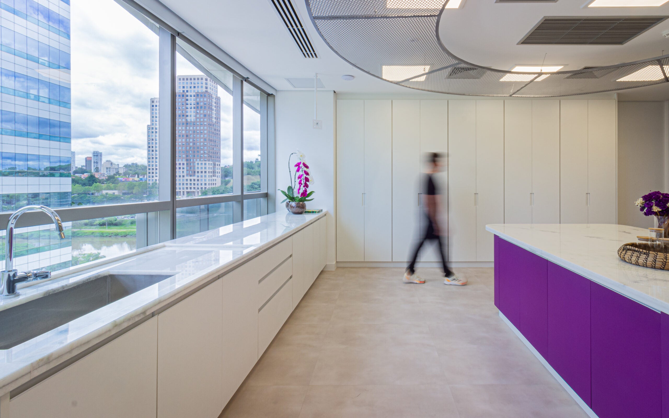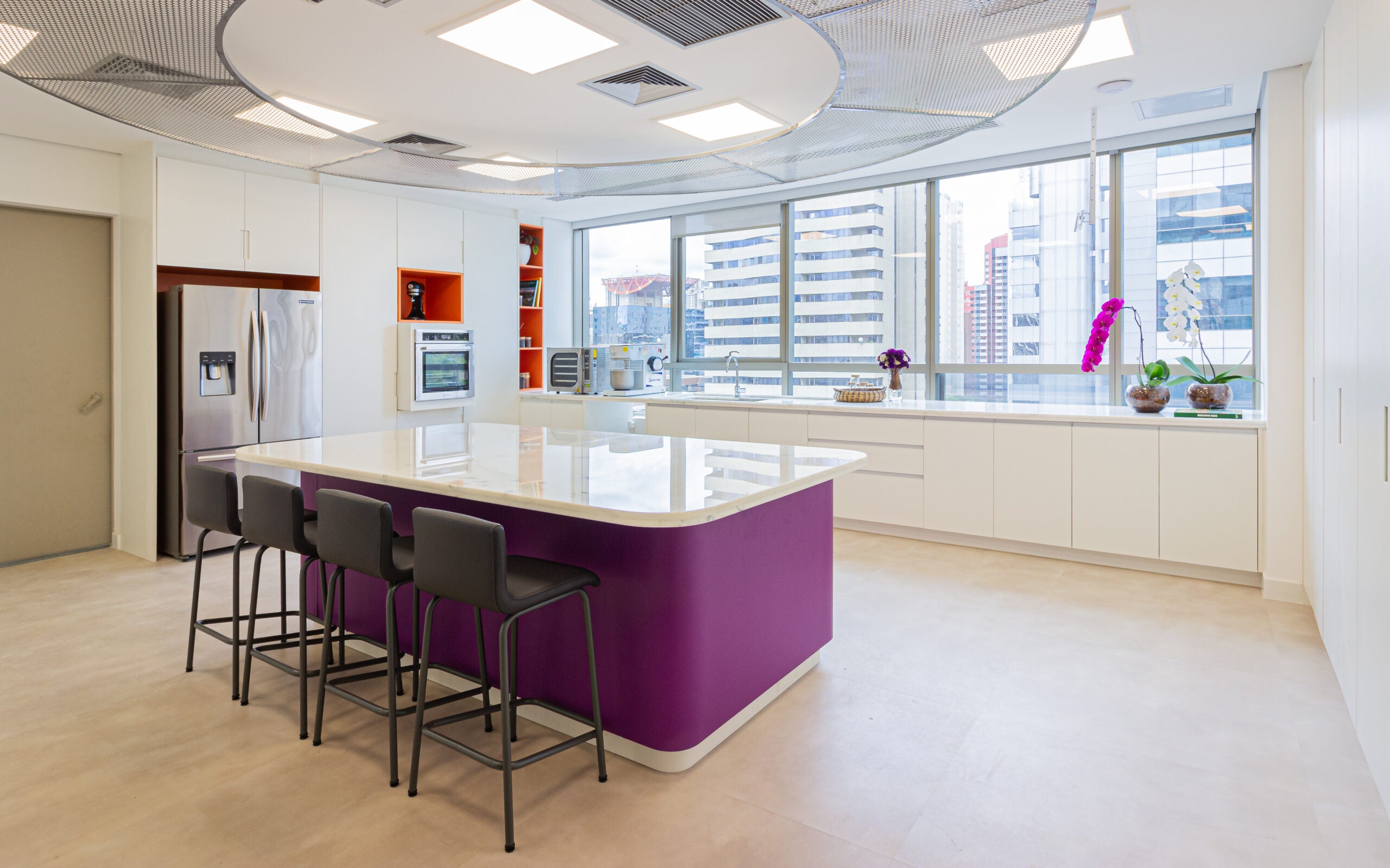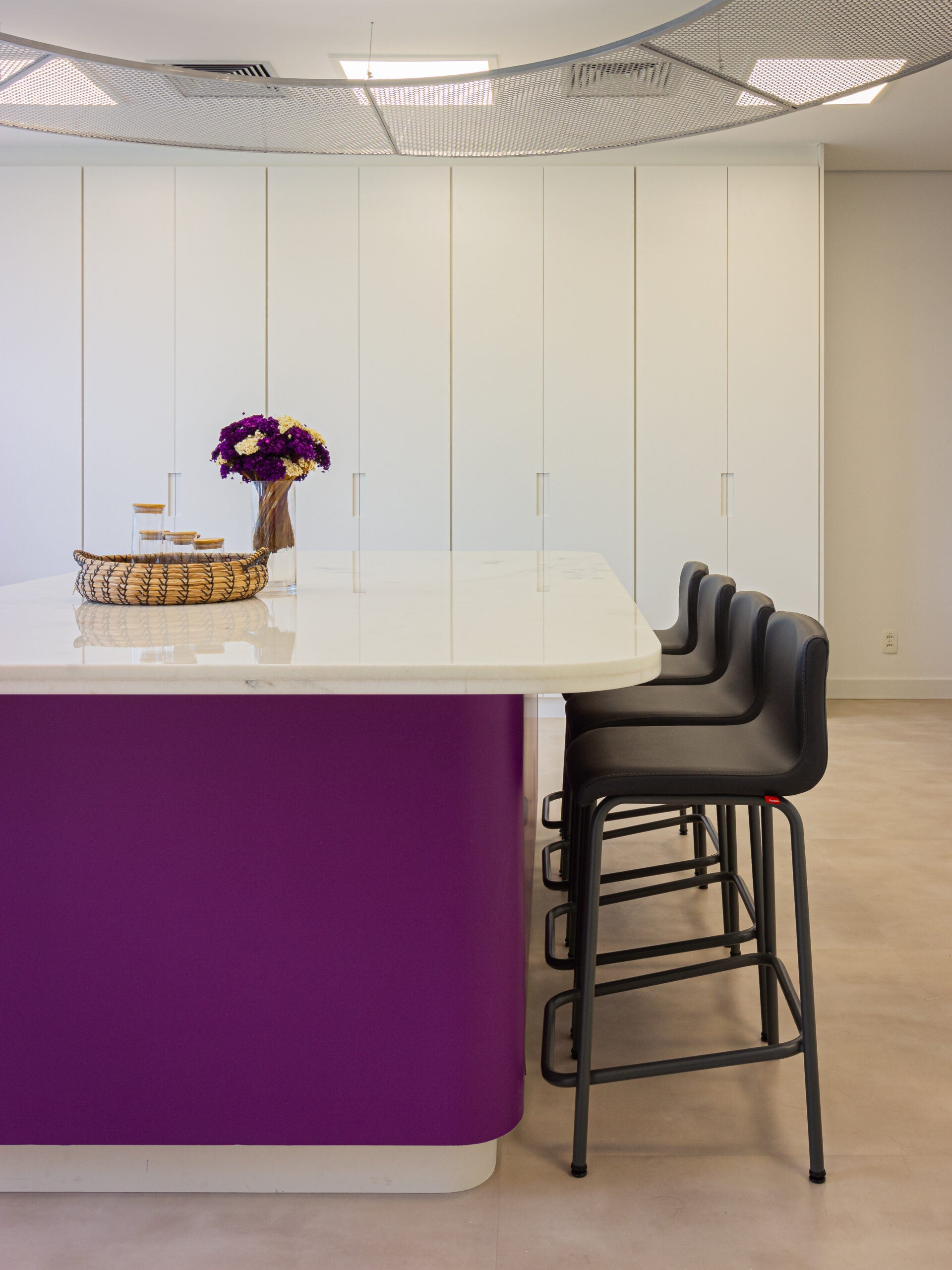 O layout se organiza a partir de uma ilha central em mármore, que atua como eixo estratégico dos processos, complementada por bancadas lineares que ampliam as áreas de trabalho e facilitam a higienização. A iluminação natural foi priorizada, proporcionando leveza e conforto visual ao ambiente.
