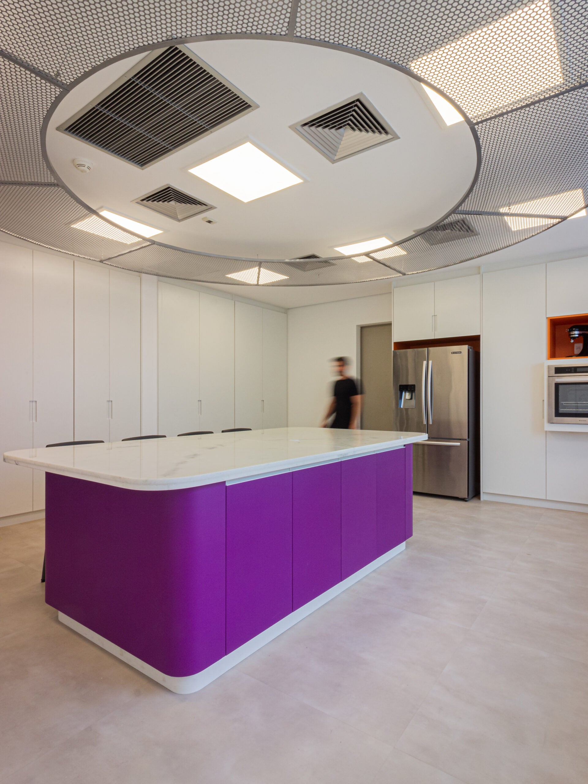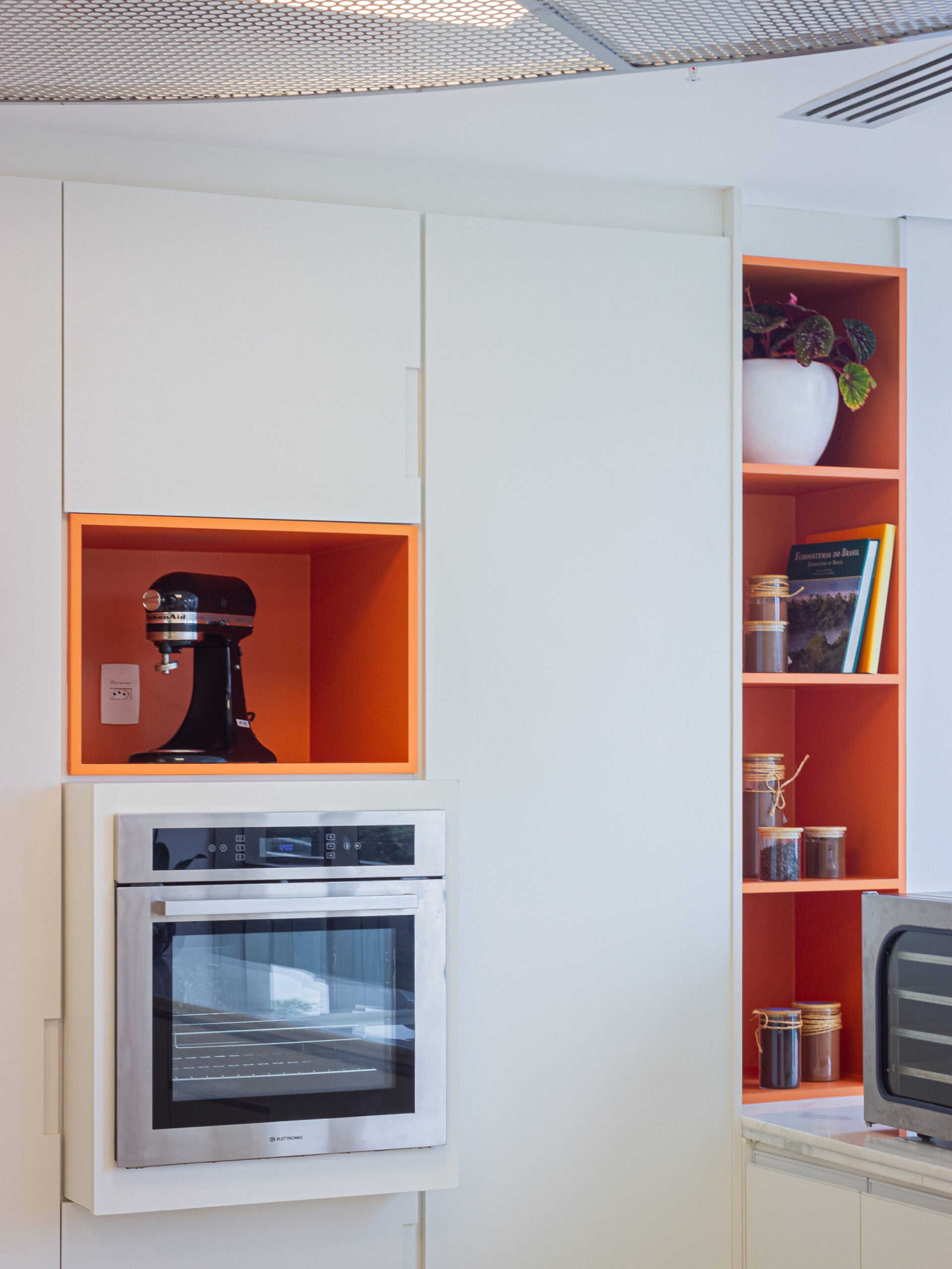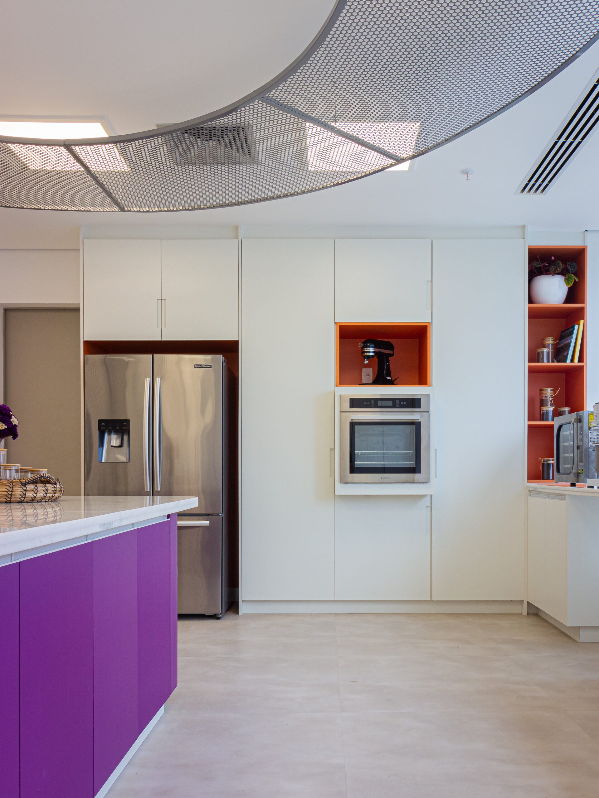 A marcenaria sob medida percorre todo o perímetro, garantindo organização, eficiência operacional e unidade visual. A paleta clara, essencial para ambientes de manipulação de alimentos, é enriquecida por pontos de cor inspirados na identidade do cliente, reforçada por elementos como a estrutura metálica circular no forro e o piso vinílico em tom cinza.